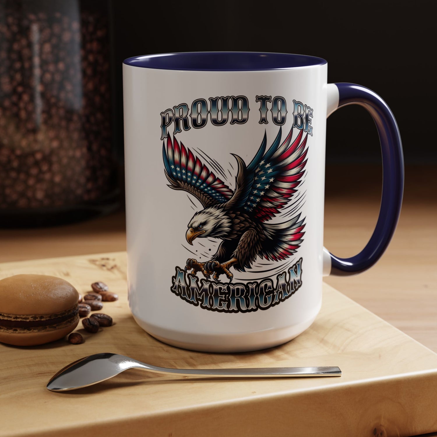 Proud to be American Accent Coffee Mug - This mug exudes patriotism and pride, perfect for enjoying a cup of coffee or tea. Ideal for those who love America and want to show it off. Great for celebrating Independence Day, Memorial Day, Veteran's Day, or any patriotic occasion.